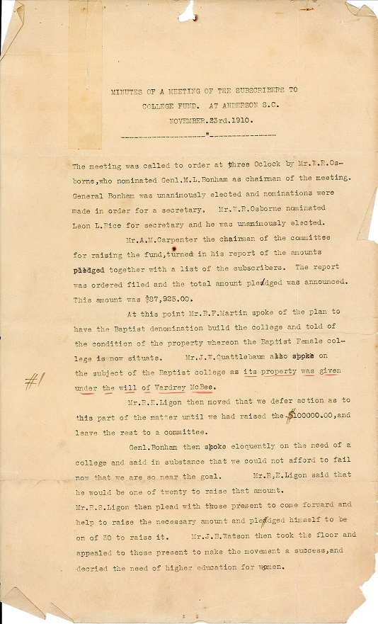 Anderson College established the tradition of the Crook, dating back as early as the 1919-1920 school year, from what can be verified, but is believed to be as old as 1917. The origin of "hide-the-crook" tradition is common in higher education, but is unclear to any specific institution. Montevallo University (formerly Alabama College) has a longstanding history that is still running today, but their tradition is only traceable to 1926, where the "Finder" is recognized at their Founders' Day celebrations. Today, they continue the Crook tradition with updates about the Crook's whereabouts in emails and social media posts. Additionally, "crooking" traditions are found in Meredith College in Raleigh, NC, and Averett University in Danville, VA, but are present in other higher education histories as well. This tradition most commonly originates with all-female liberal arts schools in the South. It is likely that Anderson College inherited the tradition when Annie Dove Denmark and Grace Cronkhite came from Meredith College to Anderson College in 1917.
