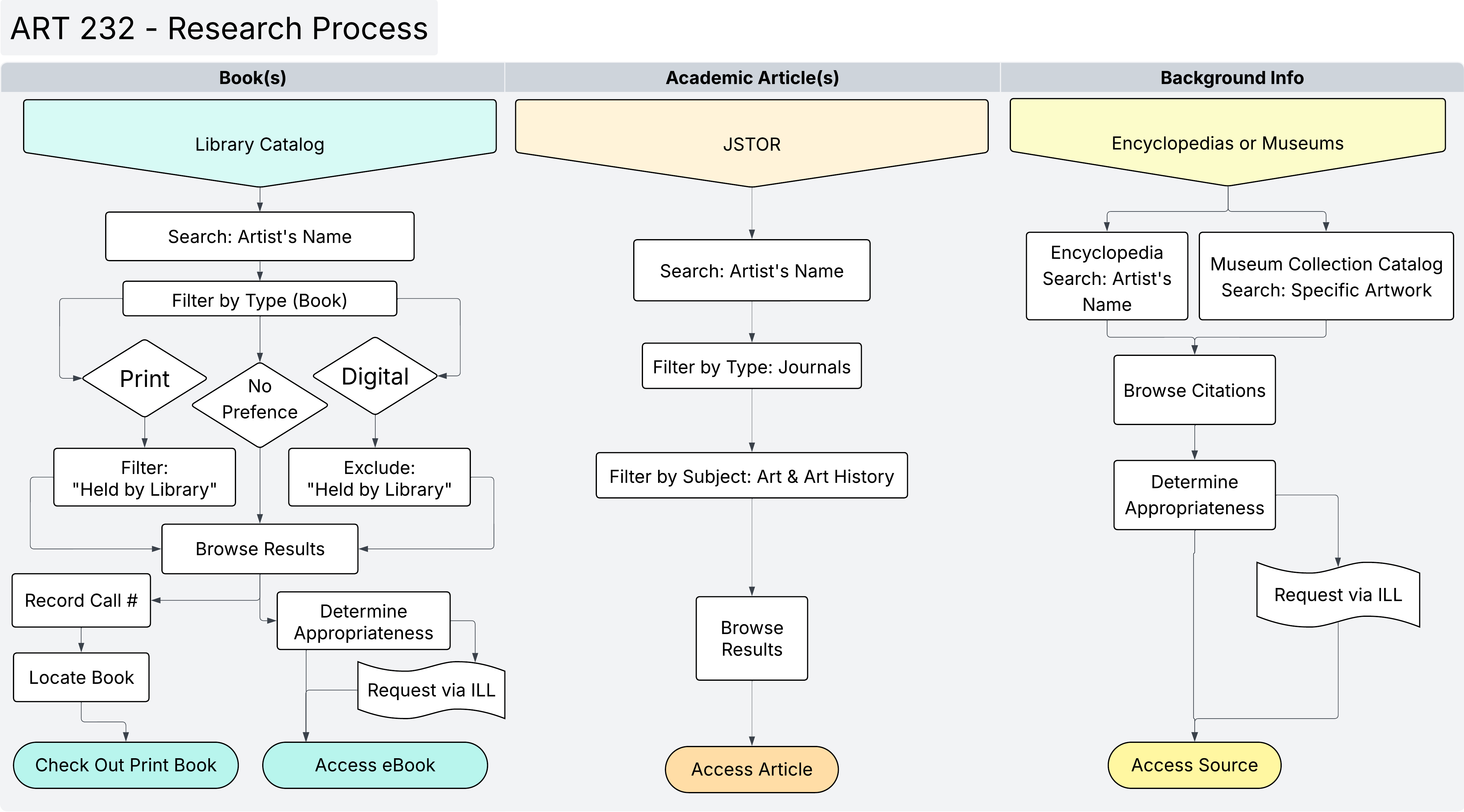 For this course's research project, you will need at least one physical book and two academic articles of at least fifteen pages in length. In order to locate these resources, you can consult this flowchart and follow these steps to access each material.